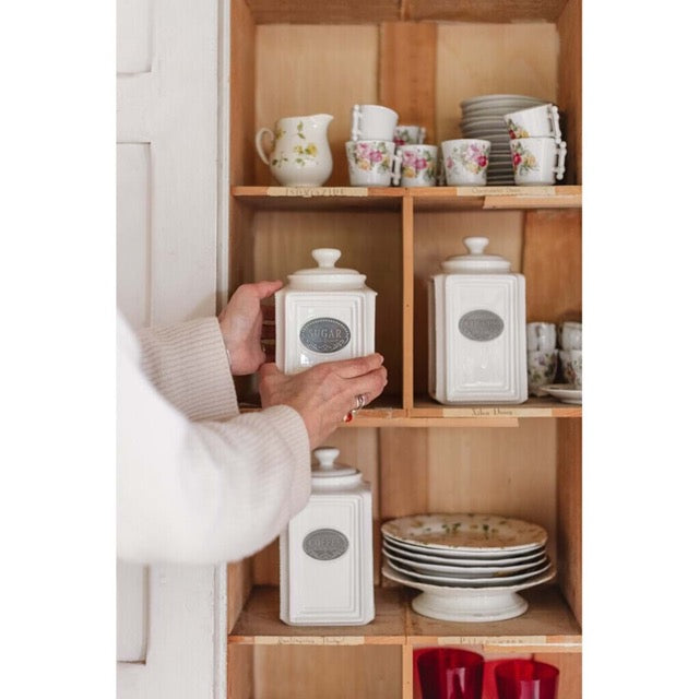 Barattolo da cucina in ceramica con tappo e scritta TREATS su fondo nero.