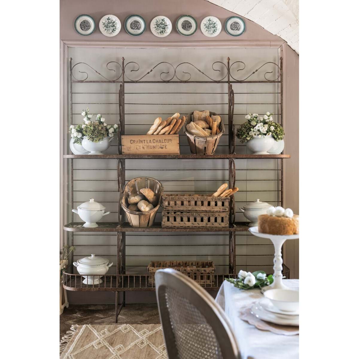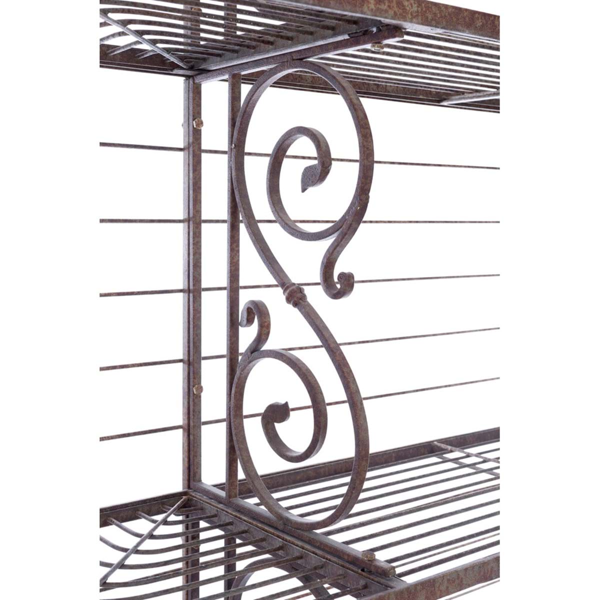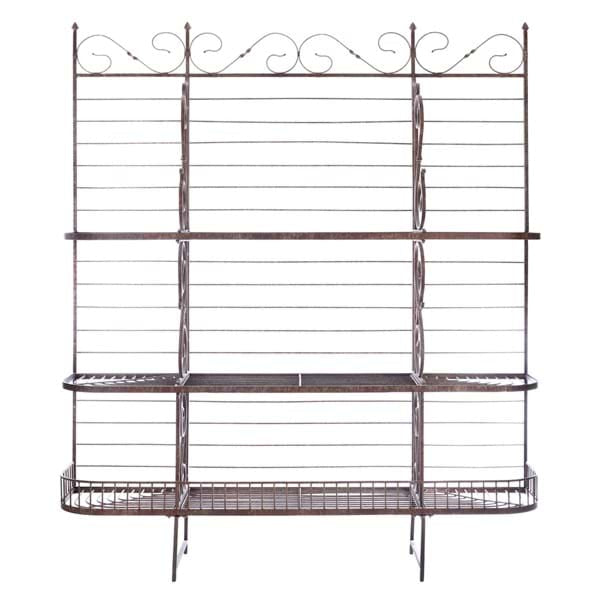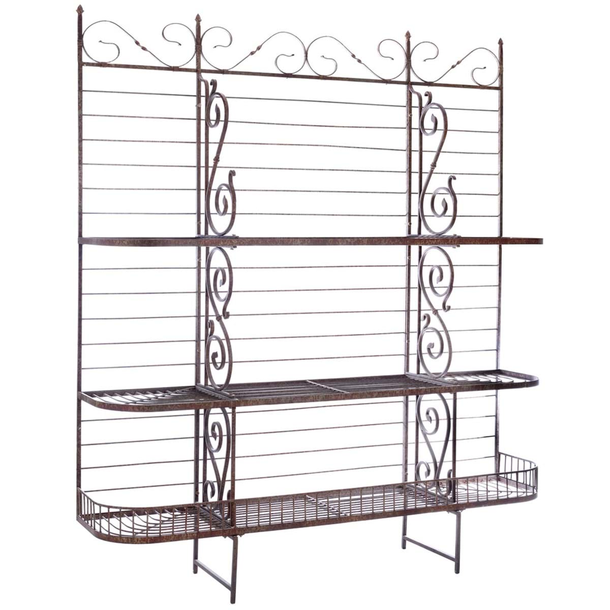 Etagere in metallo anticato Blanc Mariclò, dalle dimensioni molto grandi, tre scomparti ad ogni mensola, su tre piani; Con riccioli sulla cresta in alto e su gli divisorio;