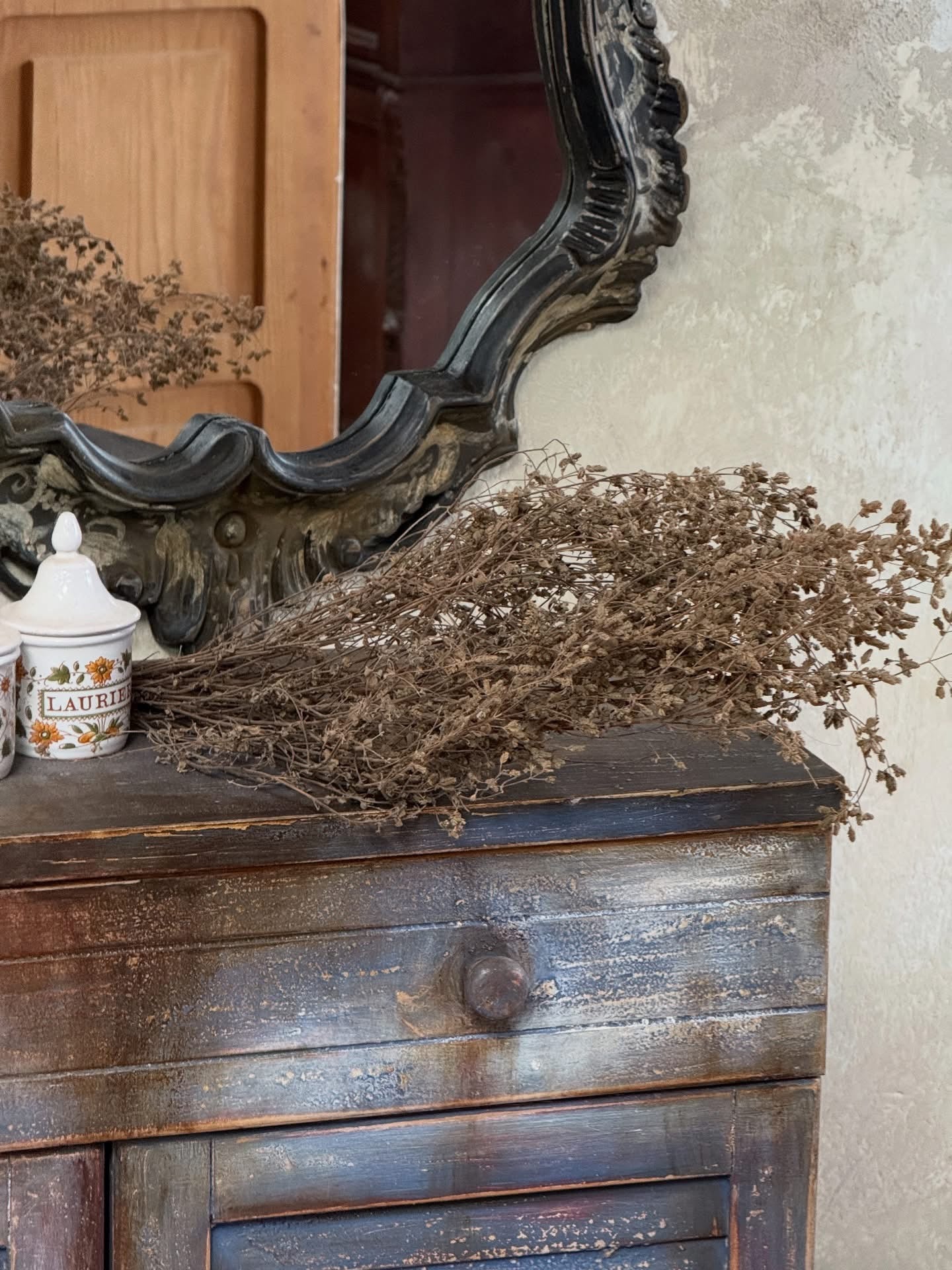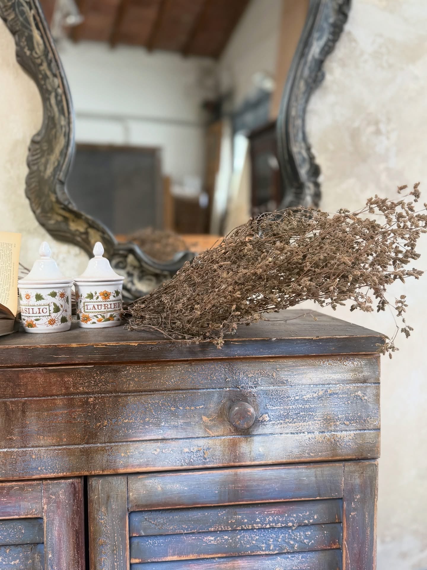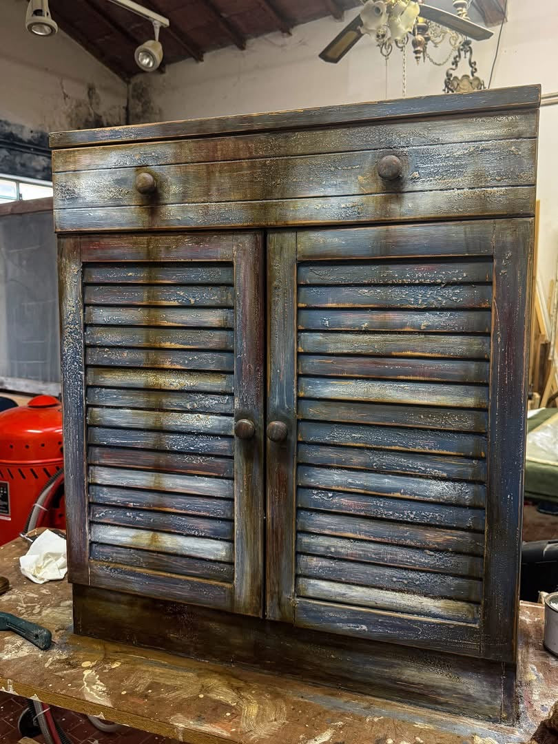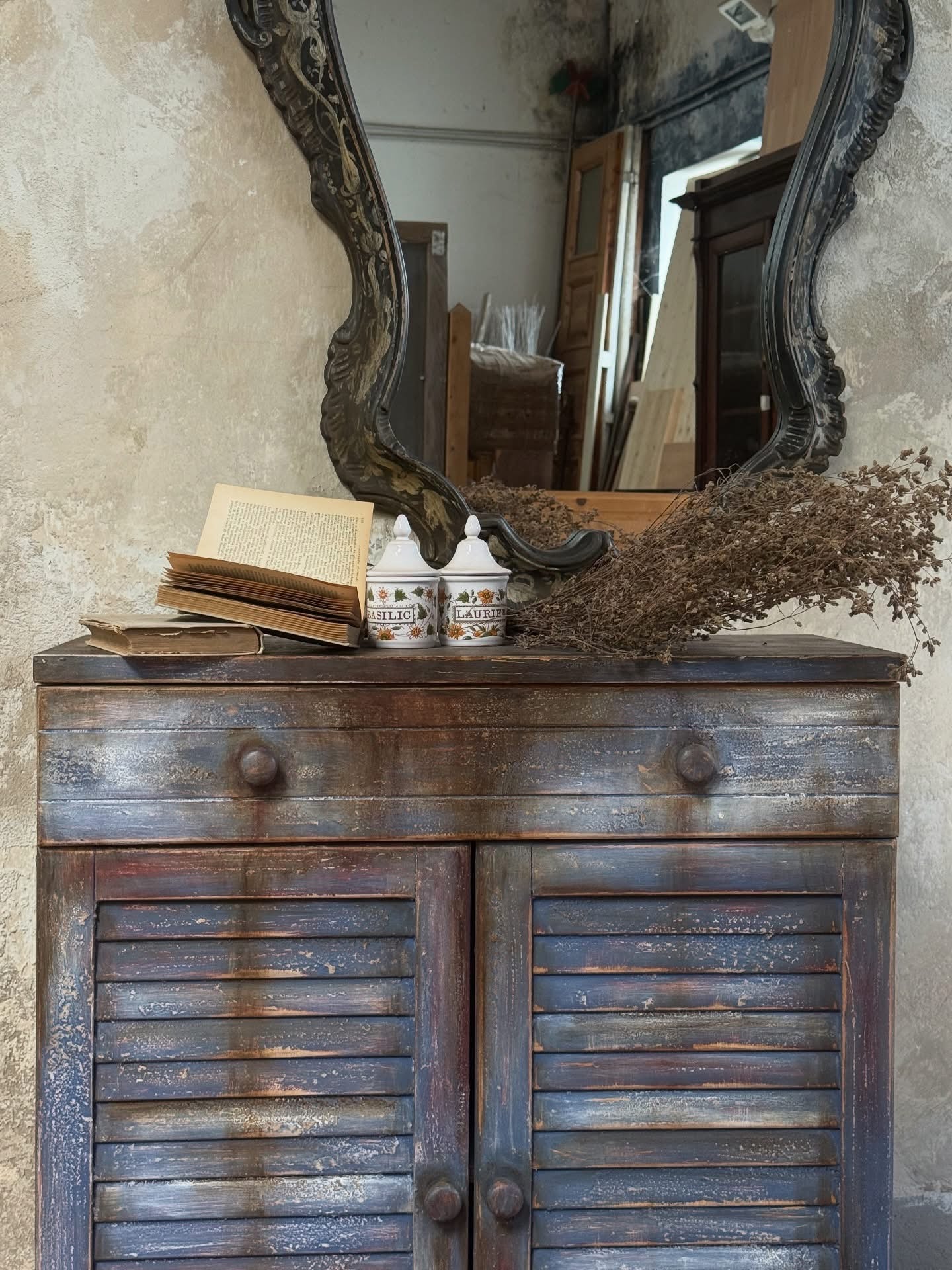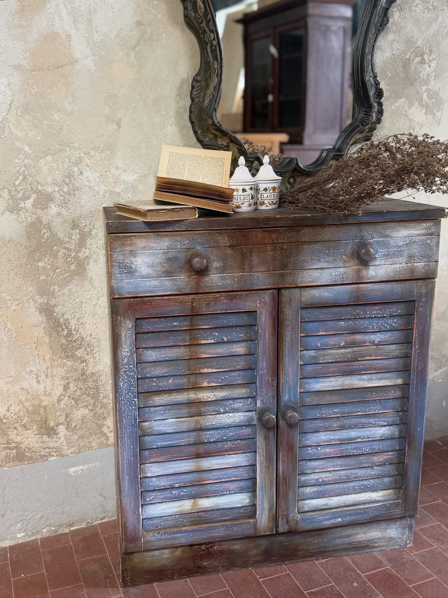 Mobile scarpiera o mobile da tv, con un cassetto e due sportelli a scuretto, coin patina antica delabrè, dai colori bluastri, e rossi.
