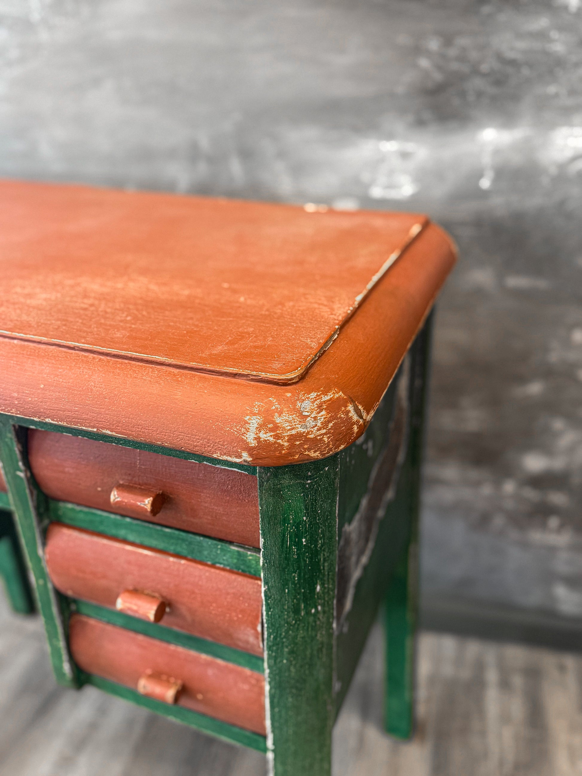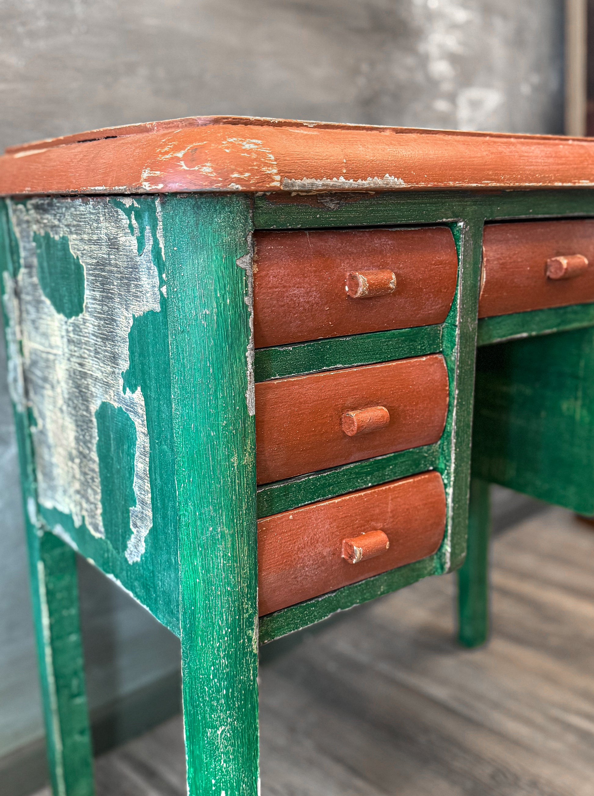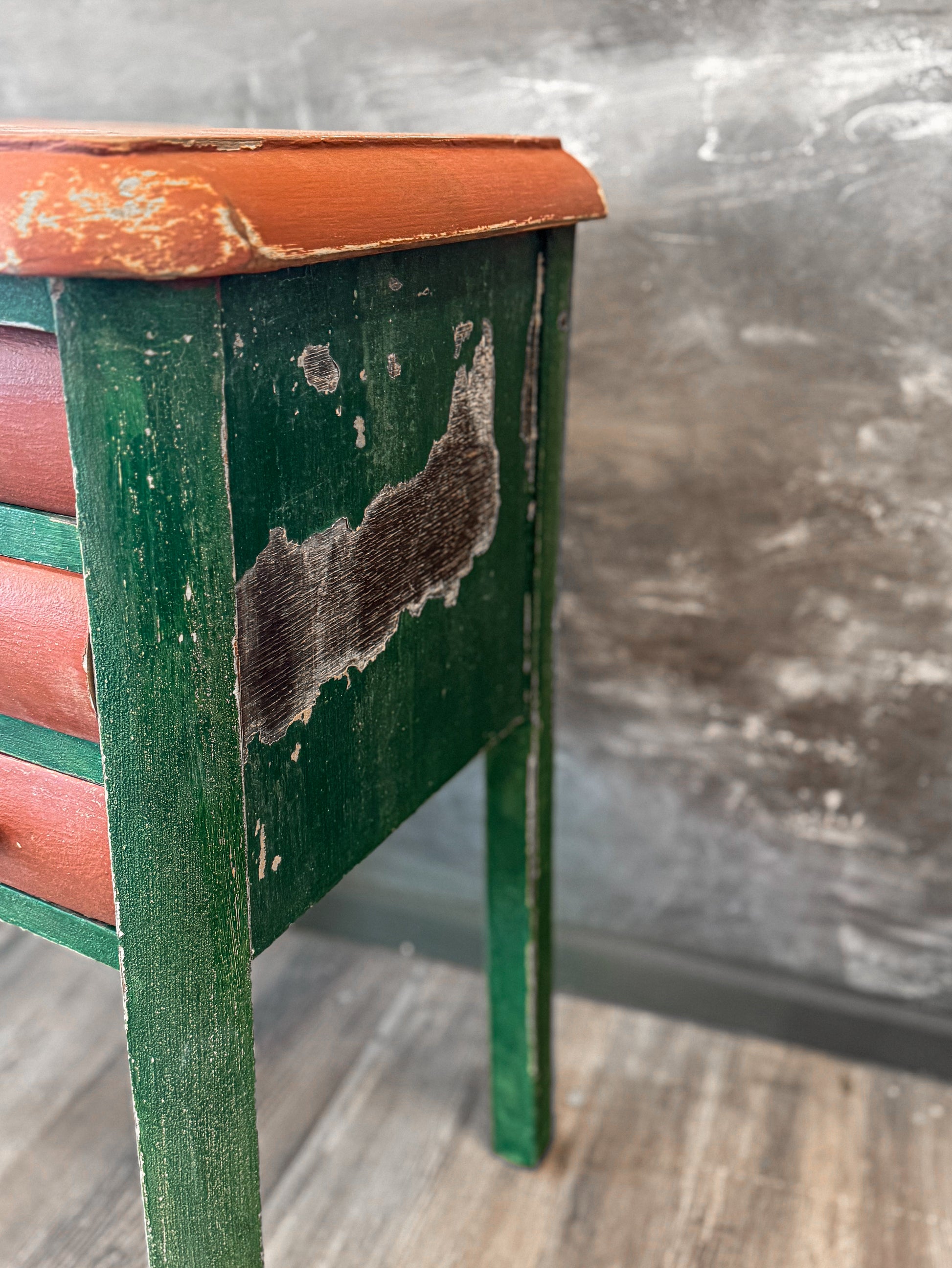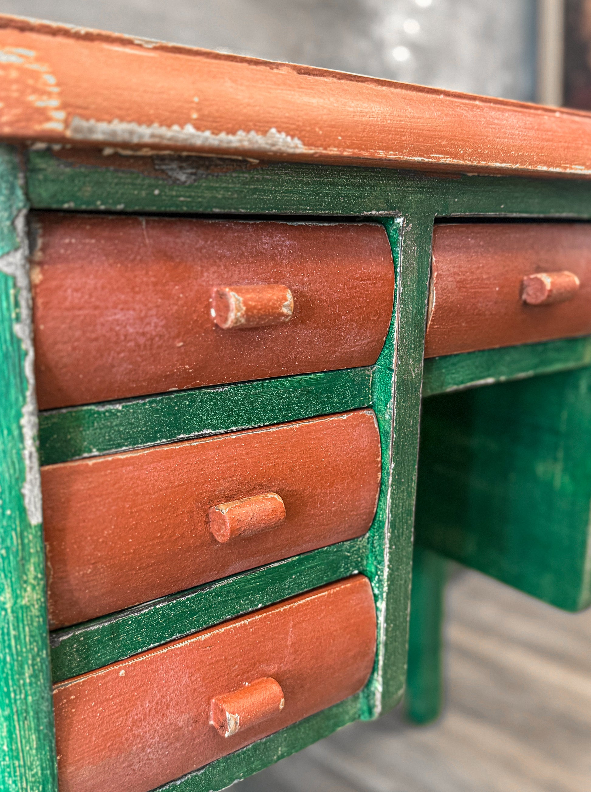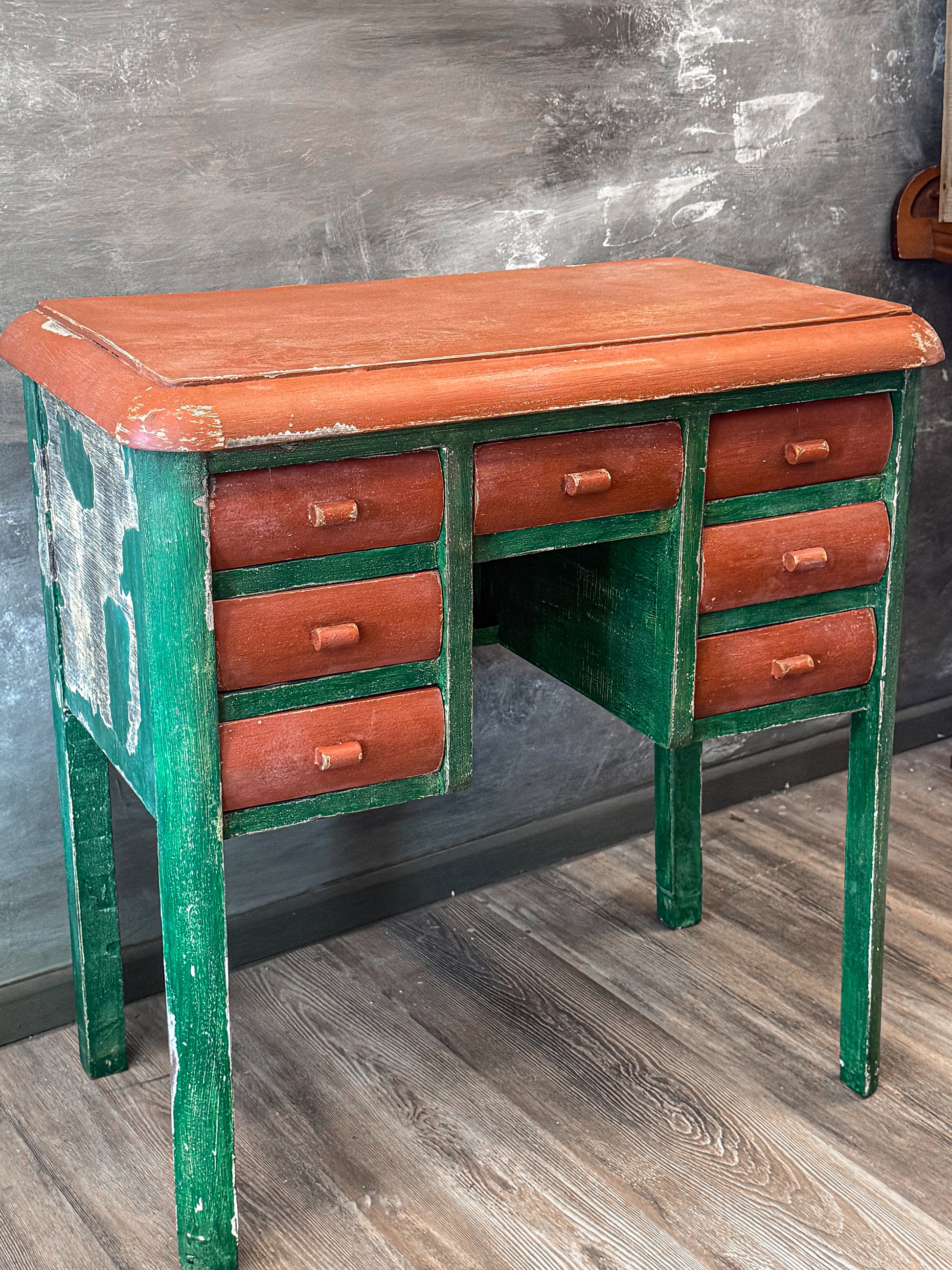 Grazioso mobiletto con sette cassettini, piccola scrivania per bambini, piccola cassettiera a porta oggetti/utensili. Vintage in patina, dai colori verdi bosco e arancio cotto.