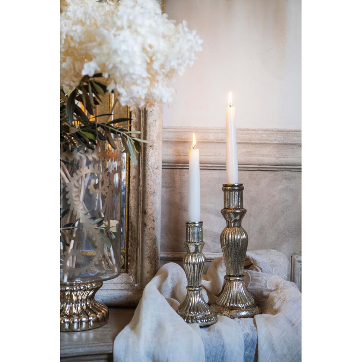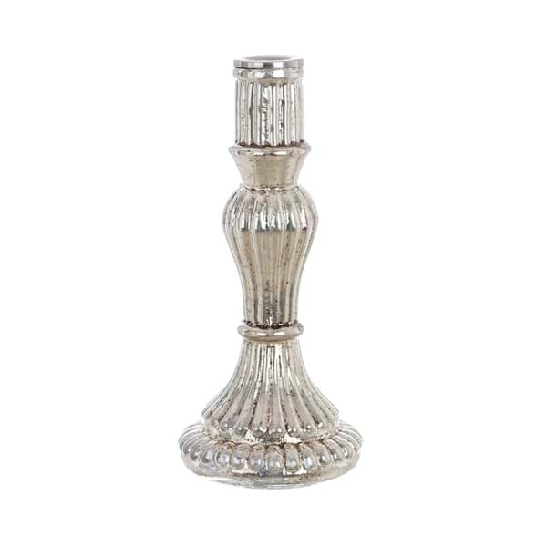 Porta candela Blanc Mariclò in vetro specchiato ed anticato. Della collezione “NOCTURNA AUREA” con forme tondeggianti e rilievi lineari.