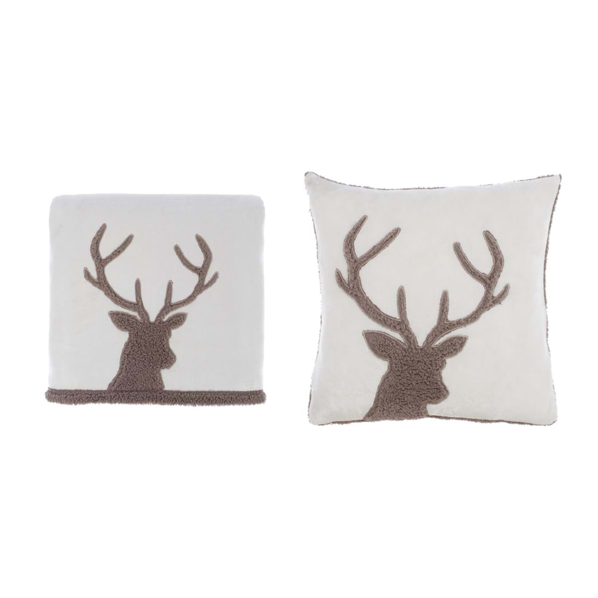 Set con plaid sherpa 410gsm e cuscino quadrato Blanc Mariclò, morbido e color bianco con la forma di una renna color marrone. Idea regalo invernale perfetta per il natale o per le rigide temperature sia in città che in montagna.